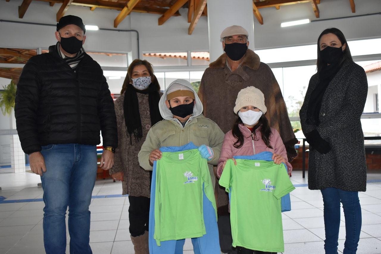 O Kit distribuído aos alunos da rede municipal de ensino contém: duas camisetas de manga curta, duas camisetas manga longa, uma bermuda e uma calça.