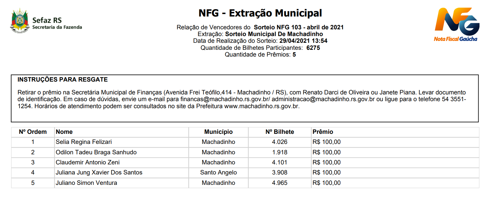 Atenção para ganhadores dos prêmios de Machadinho do mês de Abril do nota fiscal Gaúcha