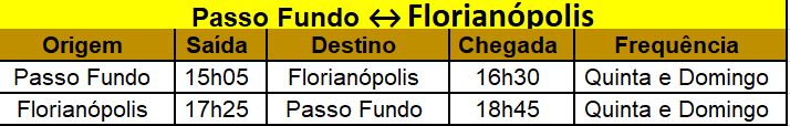A empresa Azul Linhas Aéreas iniciou a venda de passagens dos voos partindo de Passo Fundo, no Rio Grande do Sul, para Florianópolis, em Santa Catarina. A partir de 2 de julho, serão realizados dois voos semanais diretos ligando as duas cidades. A rota será operada com a moderna aeronave Embraer E2, com capacidade para transportar 136 passageiros. O trecho foi inaugurado pela própria Azul em dezembro de 2015 na modalidade sazonal, operado durante a alta temporada de verão. Agora, segundo nota da empresa, o voo passará ser definitivo e ofertado o ano todo. O voo AD2733 partirá de Passo Fundo às quintas e domingos, às 15h10, pousando na capital de Santa Catarina às 16h35. Já no sentido inverso, o voo AD2779 decolará do aeroporto de Florianópolis às 17h25, com previsão de chegada na cidade gaúcha às 18h45.