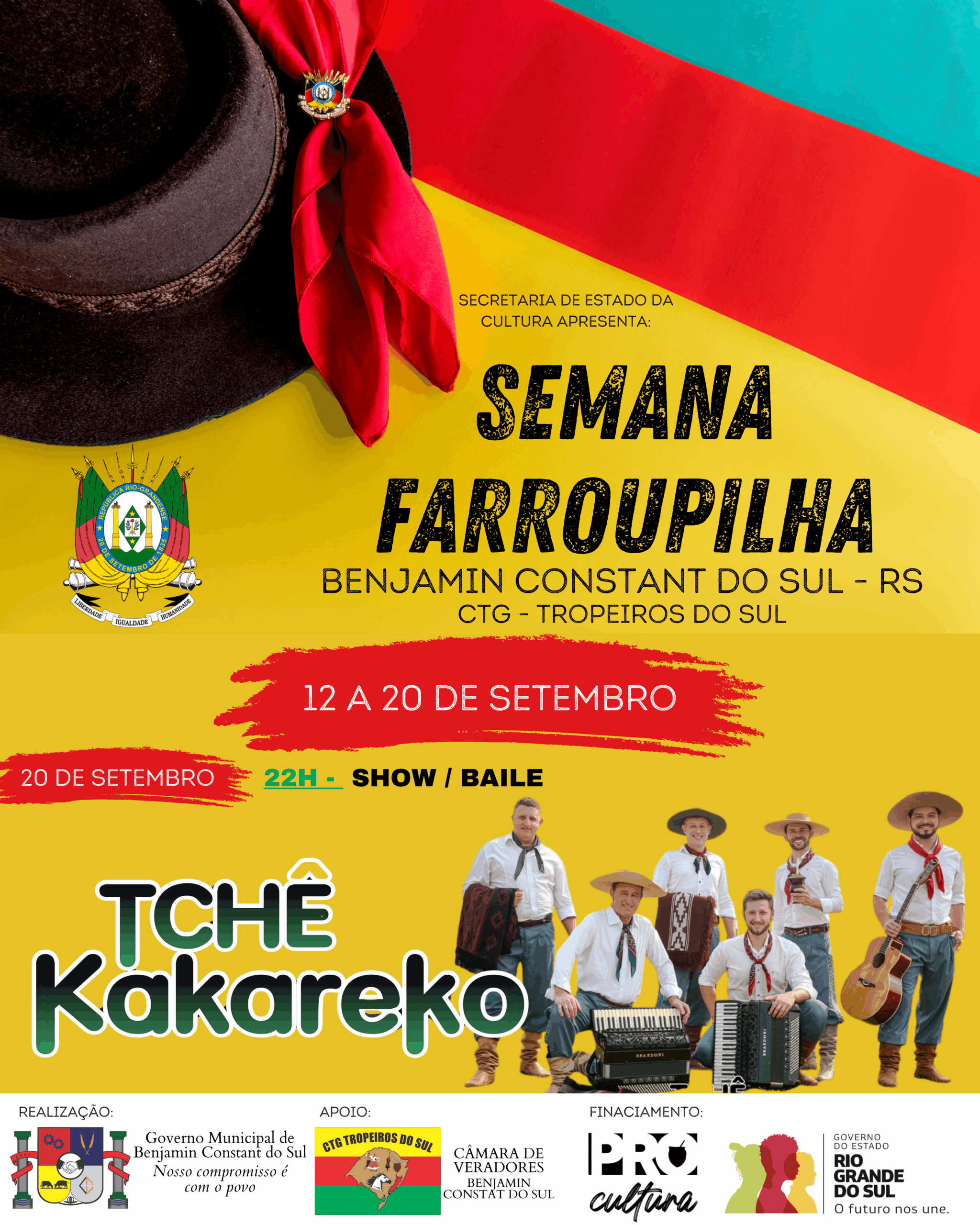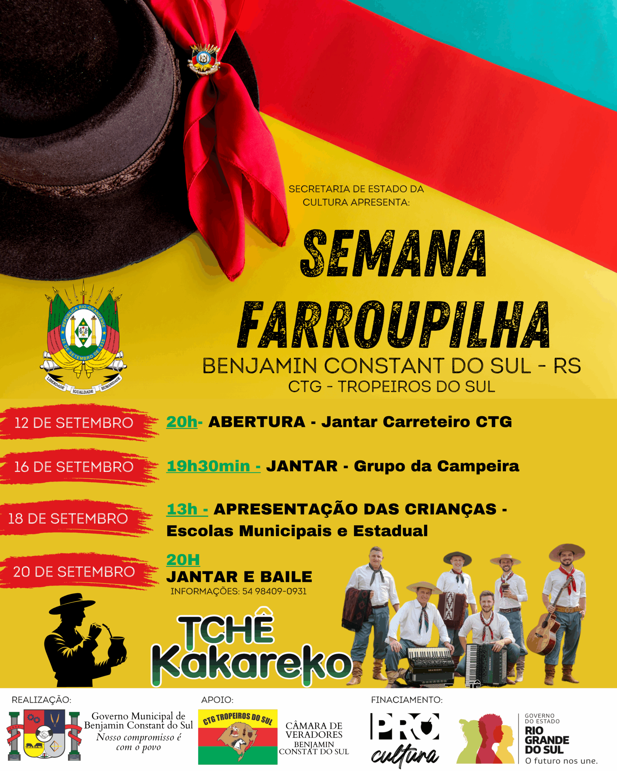 Em setembro, o coração do Rio Grande bate mais forte. A Semana Farroupilha, celebração tradicional do povo gaúcho, ganha vida em Benjamin Constant do Sul com uma programação especial que valoriza a cultura, a história e o espírito coletivo da comunidade. O CTG Tropeiros do Sul será o palco dessa verdadeira imersão na identidade gaúcha.