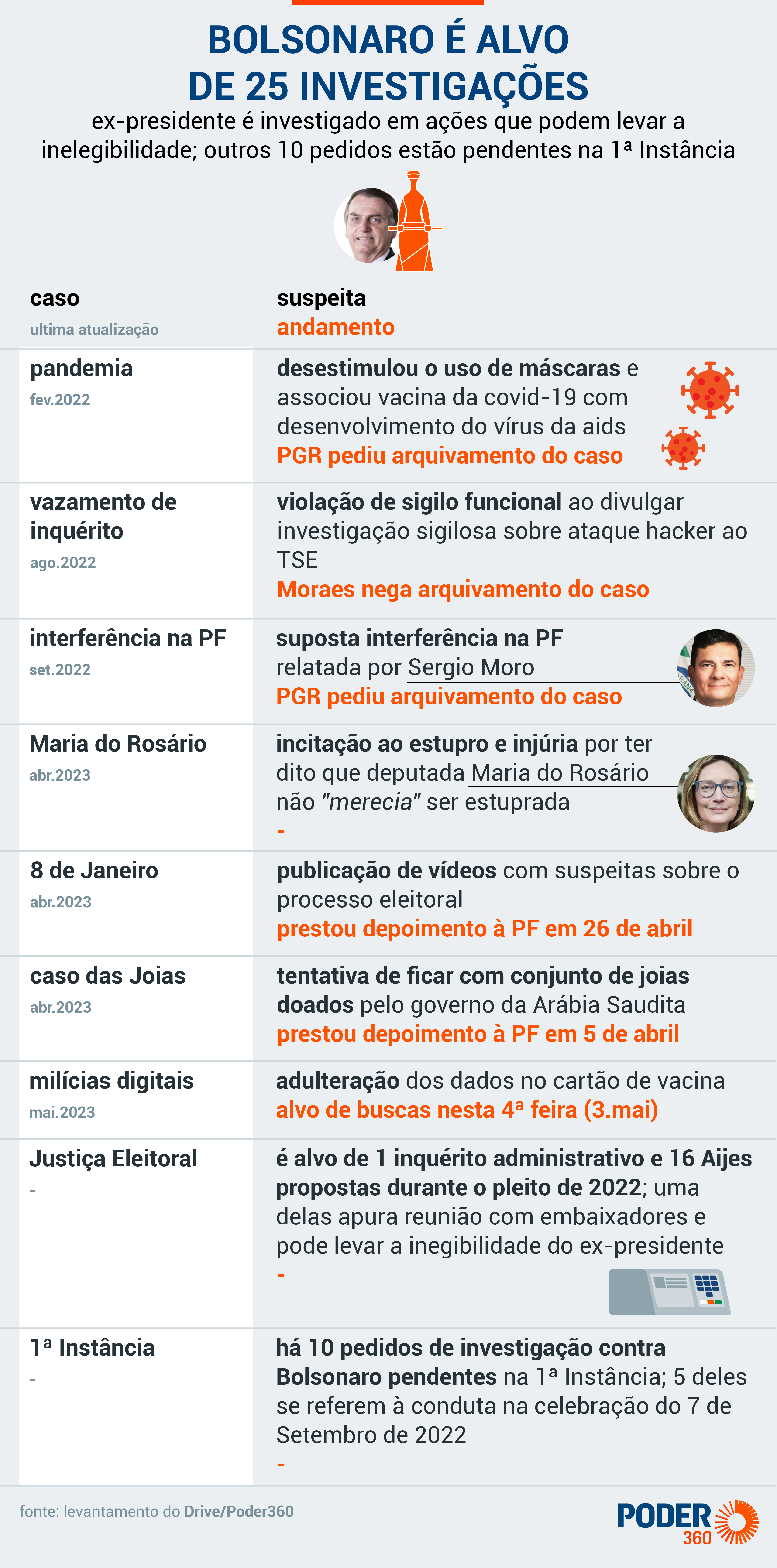 Bolsonaro voltou a ser alvo da Justiça nesta 4ª feira (3.mai.2023) depois que a PF realizou buscas em sua residência no Jardim Botânico, em Brasília. O novo inquérito apura a inserção de dados falsos nos cartões de vacinação contra a covid-19 homologados nos sistemas do Ministério da Saúde.