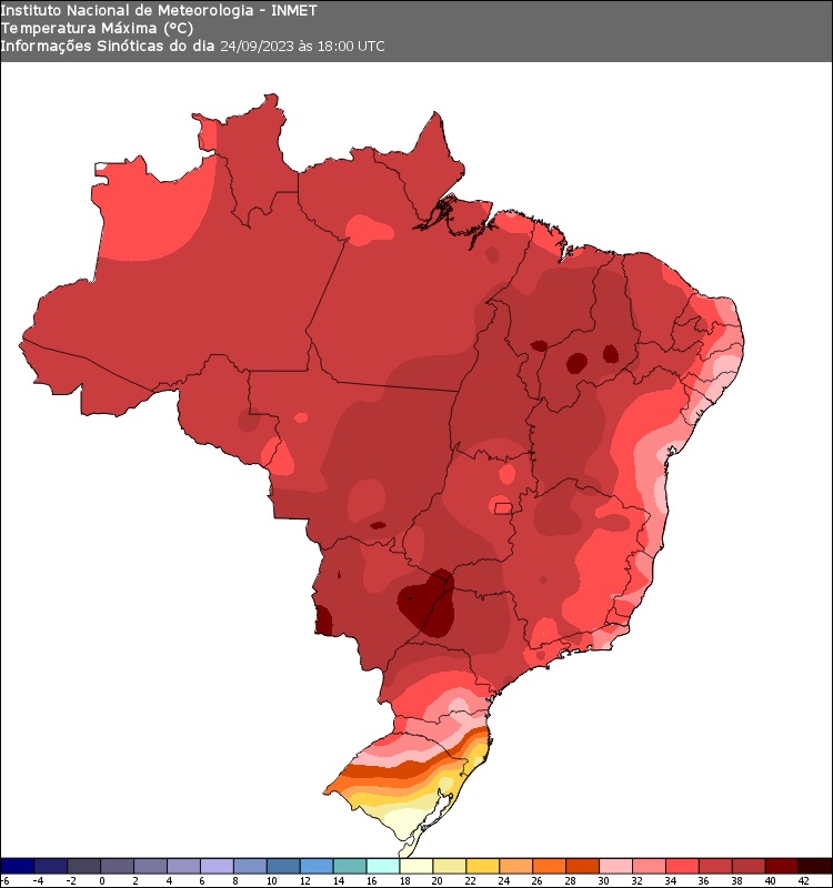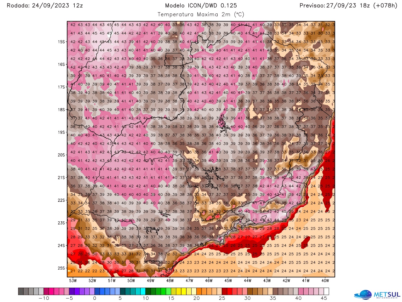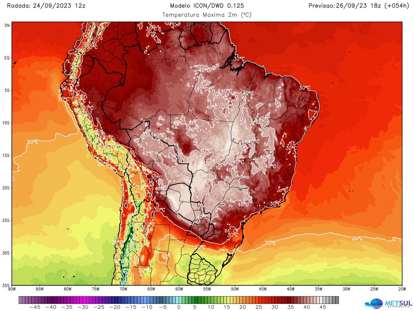 O calor segue acima dos 40ºC nos mesmos estados que alcançaram a marca hoje nesta segunda e na terça, e na grande maioria ainda na quarta. As máximas, inclusive, devem se elevar em alguns neste início de semana com máximas de 42ºC a 44ºC no Mato Grosso do Sul e no interior de São Paulo. Na cidade de São Paulo, o calor recua nesta segunda e aumenta muito na terça com máximas semelhantes às observadas hoje.