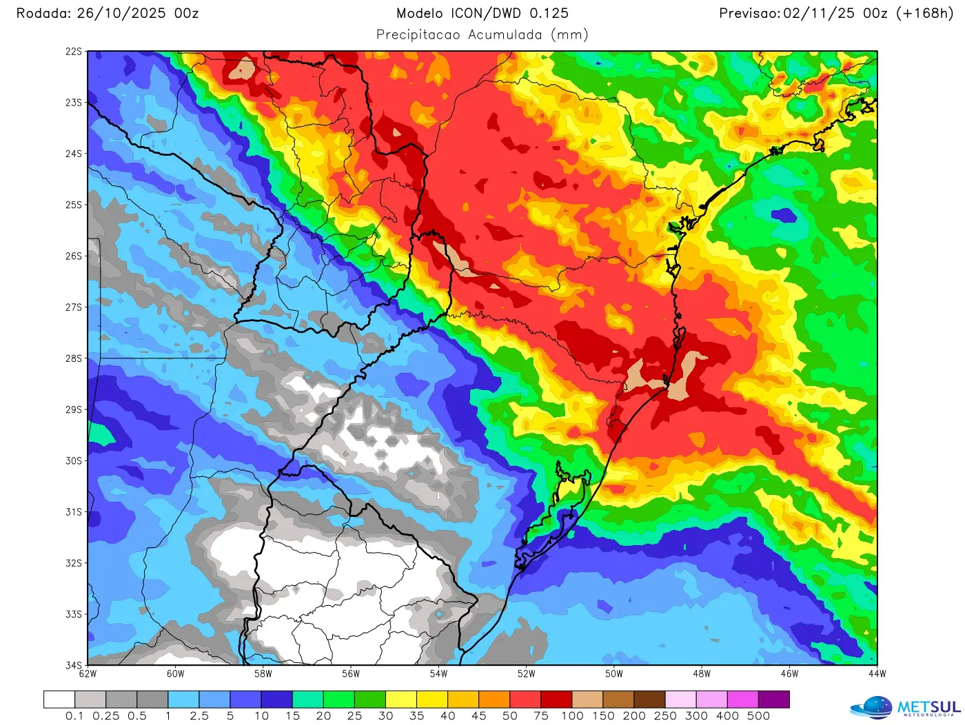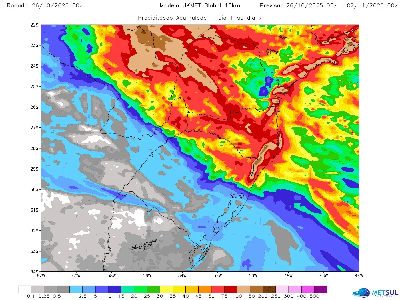 Em alguns pontos dos estados catarinense e paranaense, os totais de precipitação desta semana devem ser ainda mais elevados com volumes localizados mesmo entre 150 mm e 200 mm.