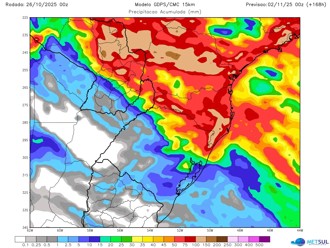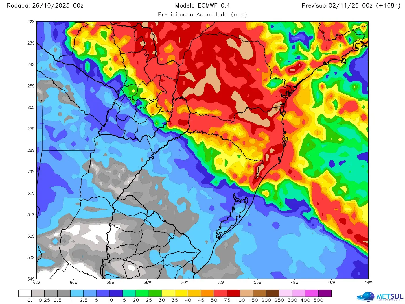 Os dados estão em pleno acordo que os maiores volumes de chuva devem se produzir em Santa Catarina e no Paraná com volume nesta semana em alguns pontos próximos e acima dos 100 mm com marcas isoladas superiores a 150 mm.