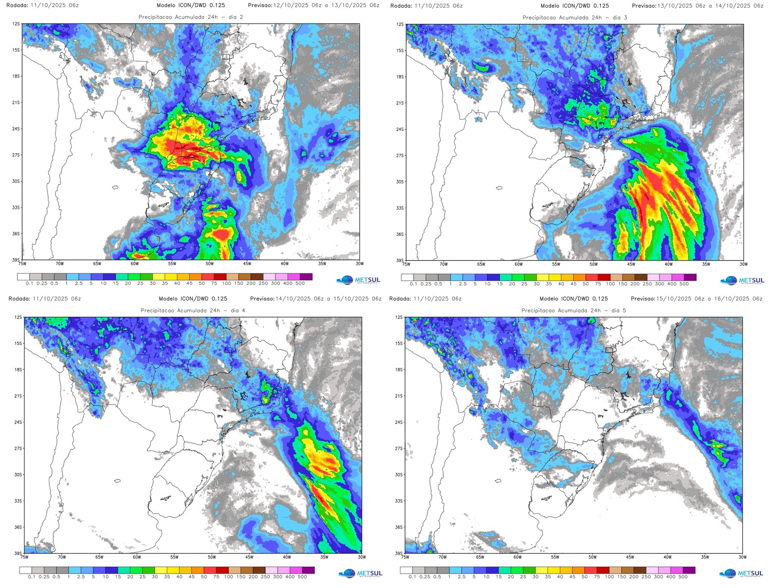 Os mapas acima do modelo meteorológico alemão Icon mostram a tendência de chuva acumulada diária para hoje, amanhã, segunda e terça-feira no Sul, Centro-Oeste e o Sudeste do Brasil.