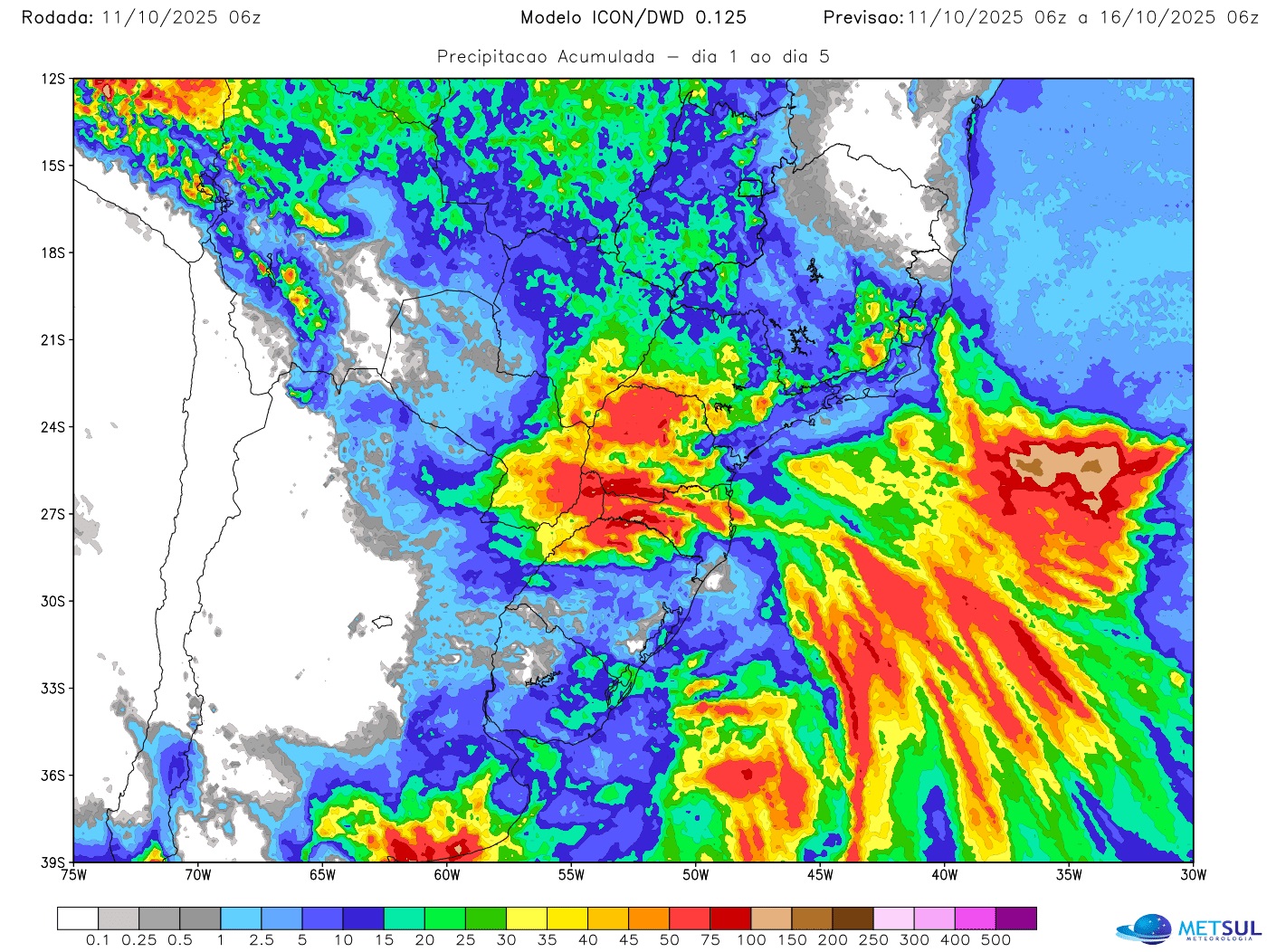Como se observa no mapa acima do modelo Icon com a chuva na soma de cinco dias, os maiores volumes na atuação do sistema frontal devem se dar no Noroeste e Norte do Rio Grande do Sul e em parte de Santa Catarina e do Paraná.