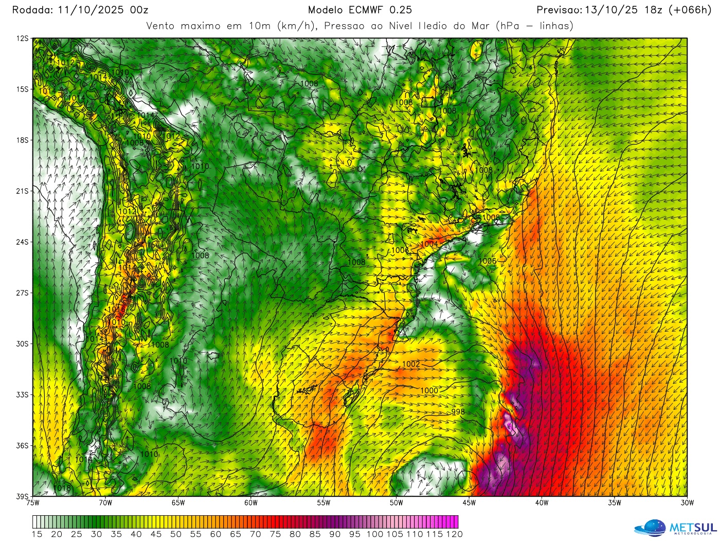 Uma vez que não se projeta um ciclone intenso e tampouco estará muito perto da costa do Sul do Brasil, não se antecipa um episódio de vento ciclônico muito significativo, embora devam ocorrer rajadas de vento.
