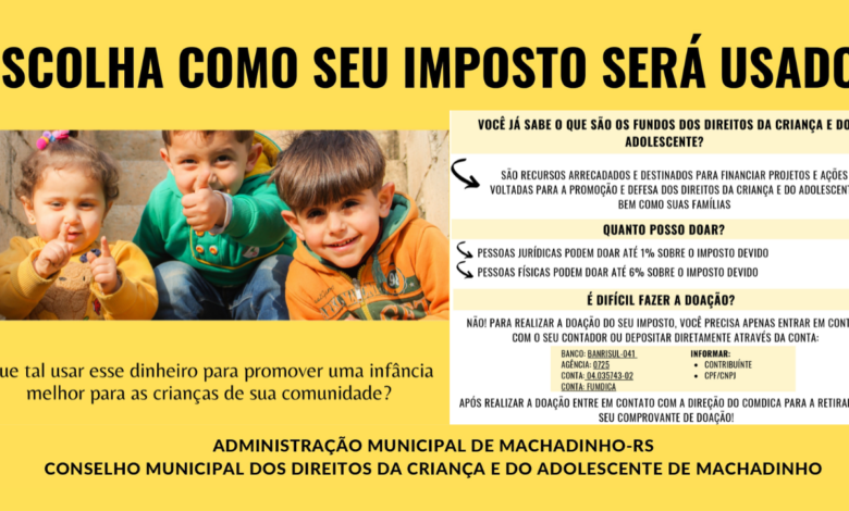Com o intuito de obter fundos para serem aplicados, segundo determina a Lei Municipal n.º 2.733/15, de 22.94.2015, em tudo o que for necessário para suportar as despesas dos programas que visem a proteção, a preservação e as garantias dos direitos das crianças e dos adolescentes, de Machadinho (RS), o Conselho Municipal dos Direitos da Criança e do Adolescente – COMDICA, lançou, no dia 28 de fevereiro, a Campanha de Arrecadação de Recursos para o Fundo Municipal dos Direitos da Criança e do Adolescente – FUMDICA, através da doação espontânea de qualquer valor monetário, em qualquer dia do ano, ou através da doação de parte de seu imposto devido, quando da Declaração do Imposto de Renda.