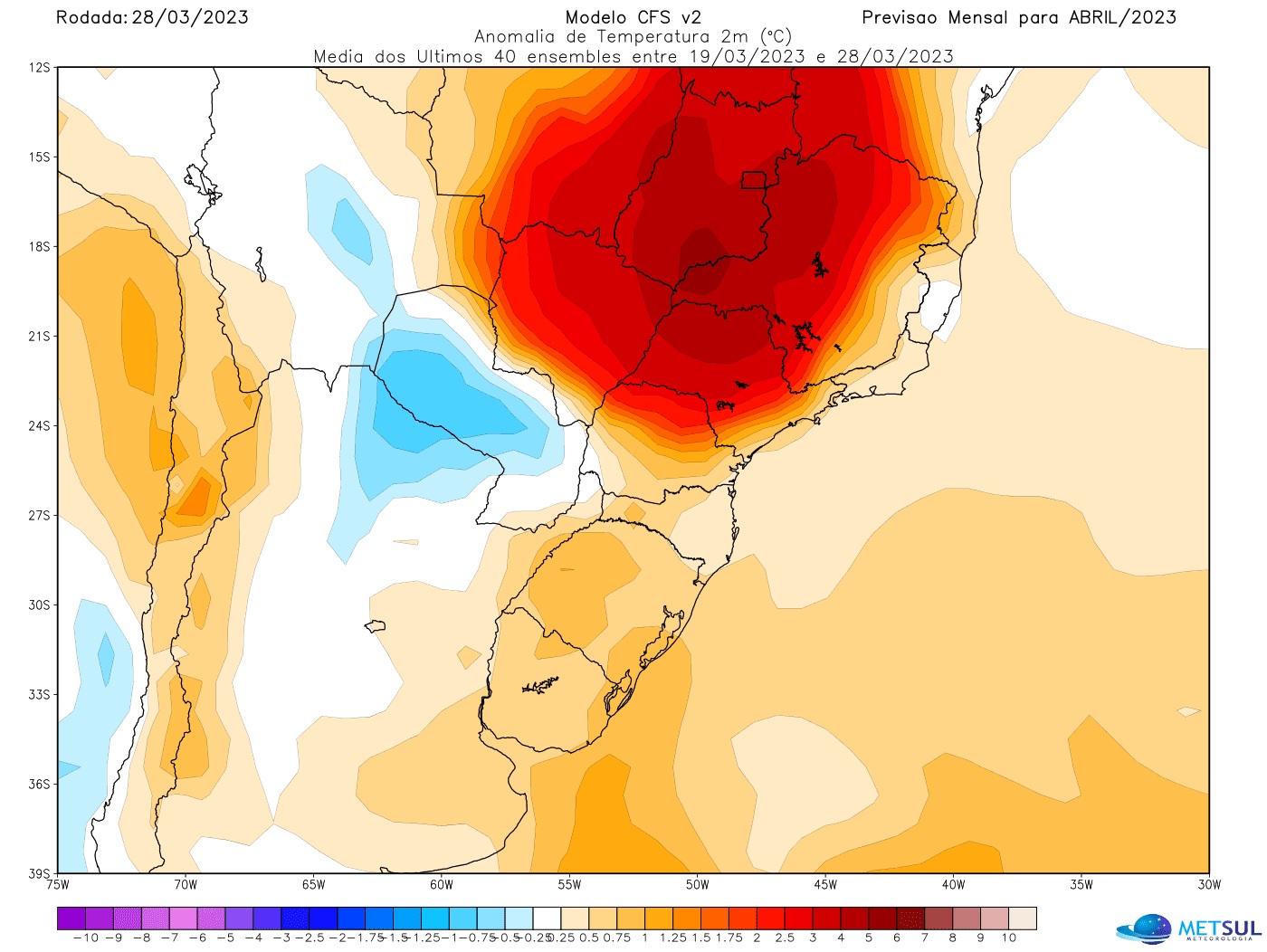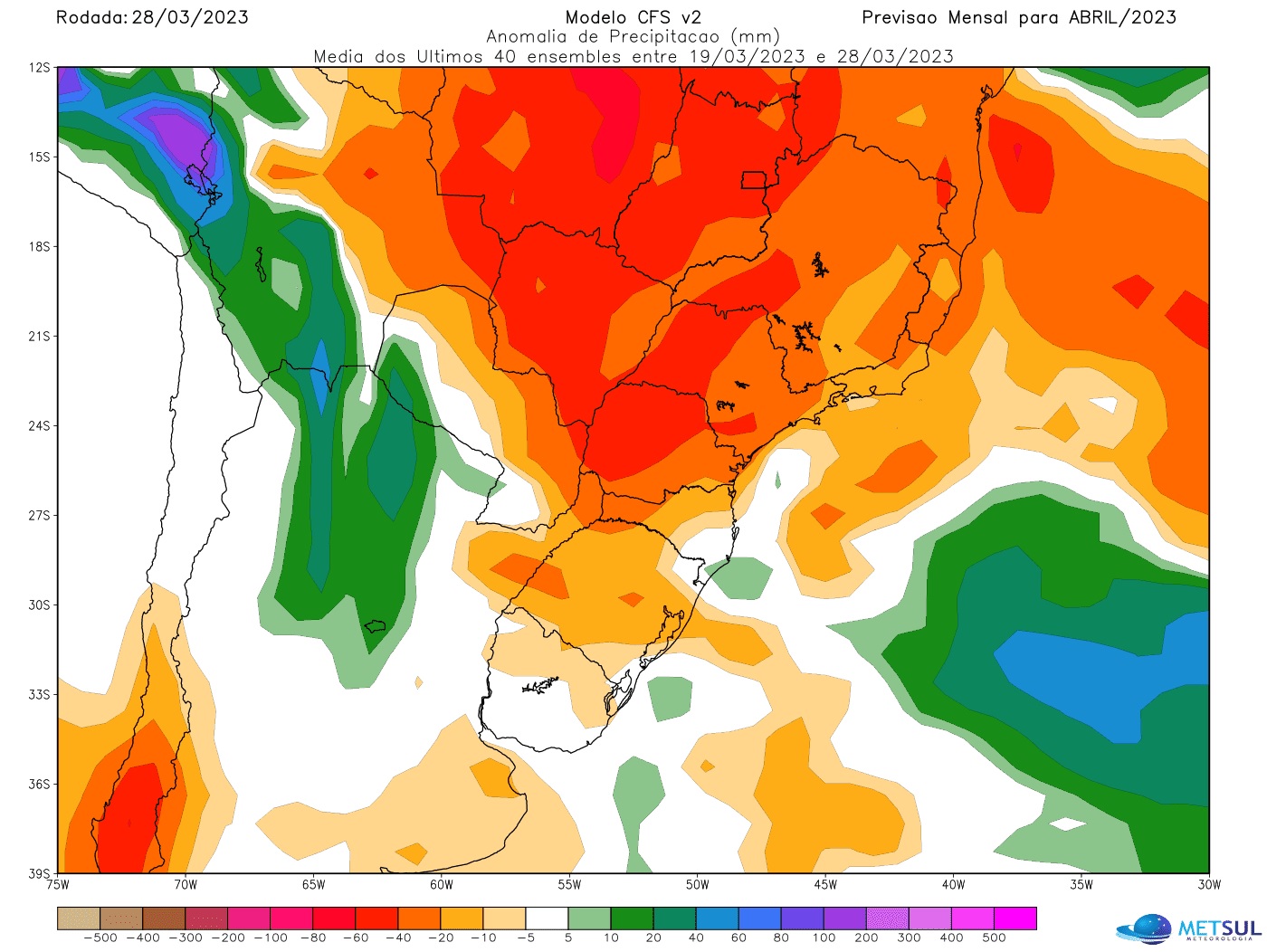 Embora a maioria dos modelos indique um abril seco quase generalizado no Sul do Brasil, este não é o prognóstico da MetSul. Tal como já ocorreu em março, quando modelos projetavam chuva abaixo da média em praticamente toda a região, e o mês termina com áreas em que a precipitação está acima da média, a nossa previsão é que o mês registre chuva próxima ou acima da média em pontos do Rio Grande do Sul, Santa Catarina e Paraná.