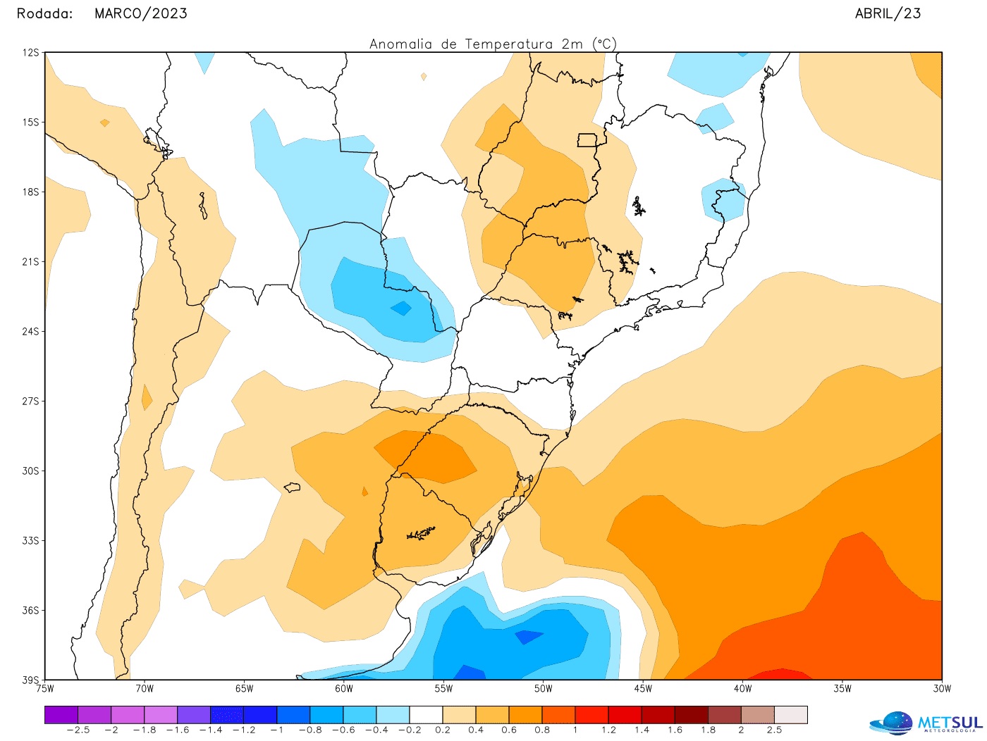 No caso do Sul do Brasil, na segunda quinzena de abril se espera que ar mais ameno a frio atue em maior número de dias na região, mas por ora nenhum dado sinaliza uma incursão de ar frio de maior intensidade. Com isso, a primeira quinzena deve ter maior número de dias quentes e a segunda uma maior frequência de jornadas amenas ou agradáveis.