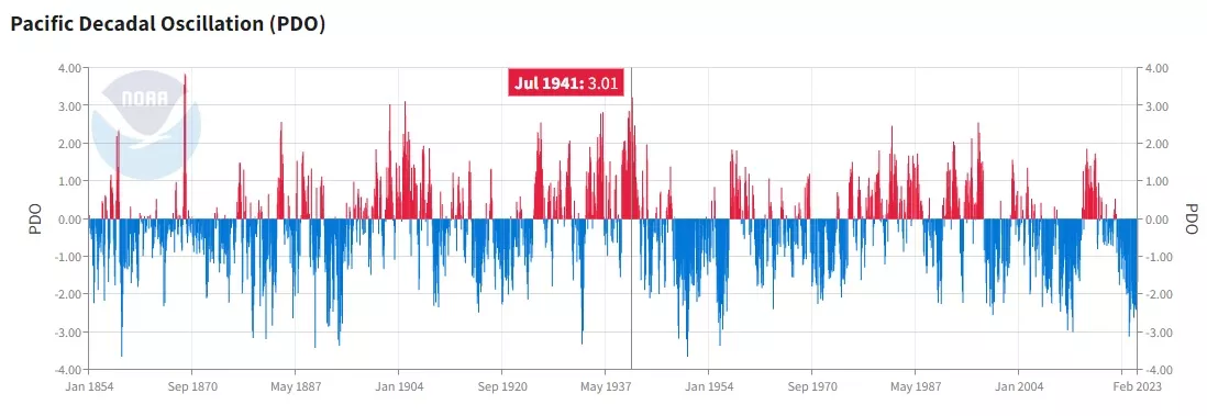 Paradoxalmente, a maior enchente ocorrida em Porto Alegre, no ano de 1941, se deu pelo volume extraordinário de chuva que ocorreu em abril daquele ano. Ocorre que em 1941 atuava um episódio fortíssimo de El Niño, um dos mais intensos da história e com valores extraordinários da Oscilação Decadal do Pacífico (PDO). No começo de 1941, os dados da NOAA indicam que a PDO atingiu quase +3 enquanto no começo de 2023 era de -1,7.