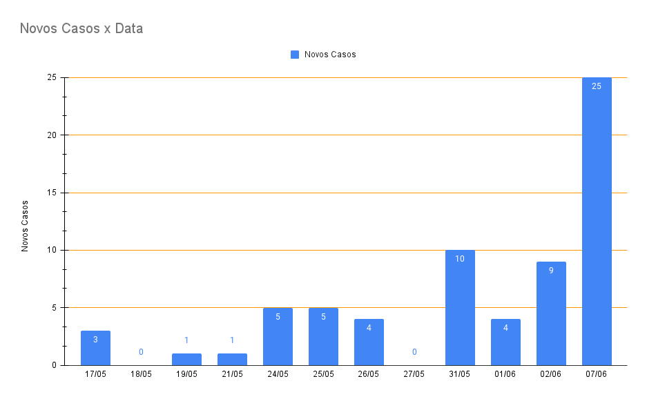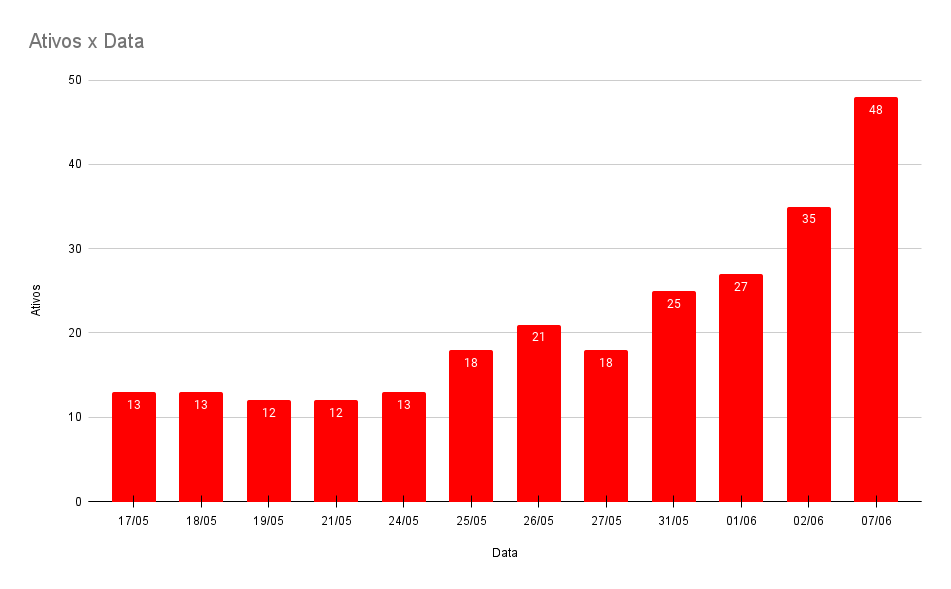 Conforme a Secretaria de Saúde do município, em uma semana os números de casos ativos quase dobraram, passando de 25 no dia 31 de maio, para 48 no dia 07 de junho. Não somente os positivos chamam a atenção, como também o número de monitorados que saltou de 49 para 98 em um intervalo de apenas sete dias. Um dado relevante e que pode ser considerado positivo é relacionado a hospitalização, onde apenas um dos casos ativos precisou até o momento de internação.