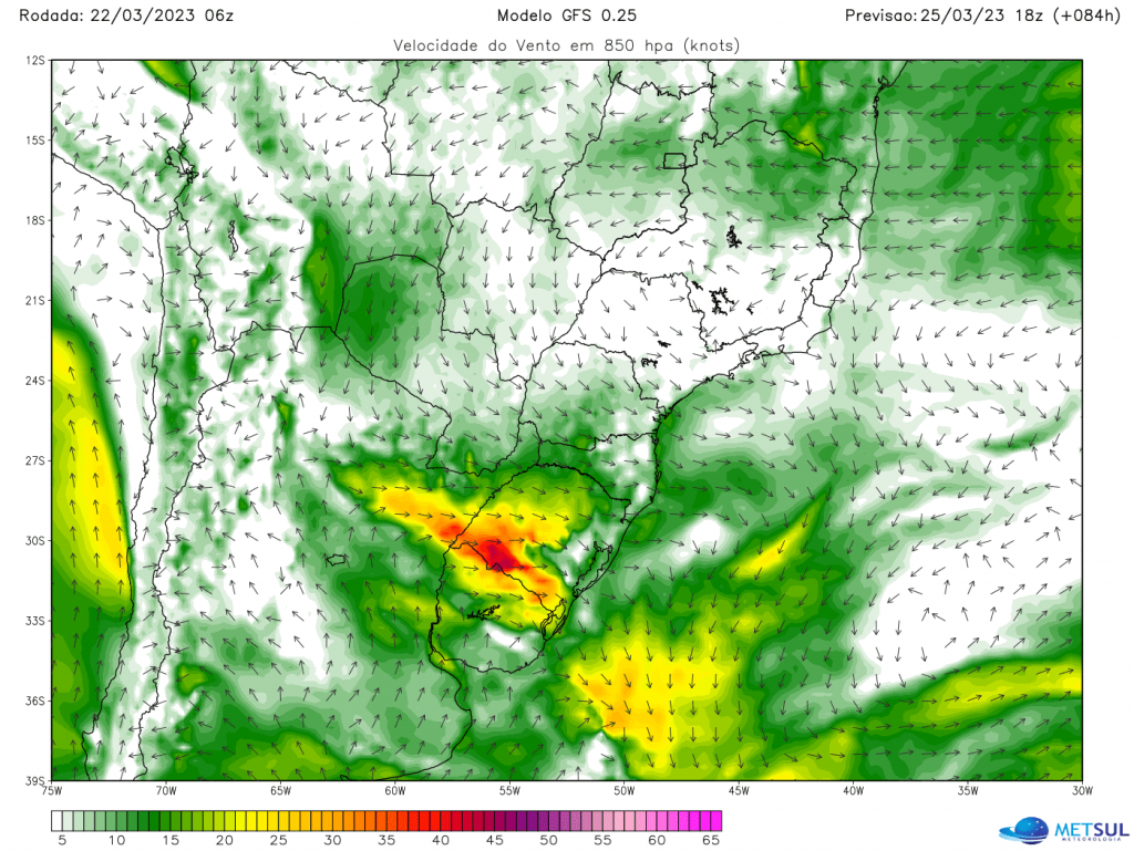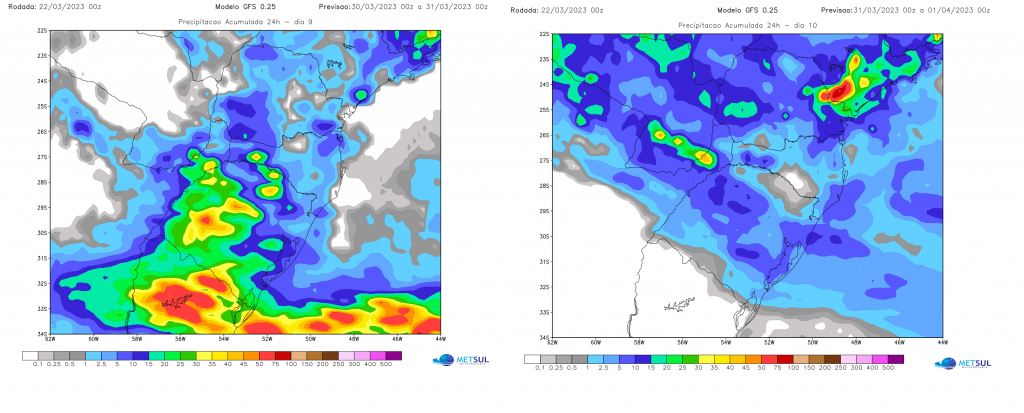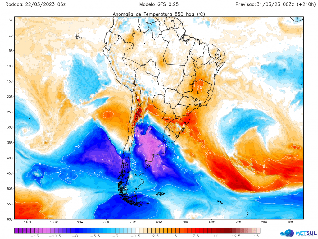Posteriormente entre os dias 29 e 31 há possibilidade de um novo sistema frontal se formar entre Argentina e Uruguai  com expectativa de mais um evento de chuva importante no Rio Grande do Sul. O interessante é que essa frente fria terá na retaguarda um sistema de alta pressão de trajetória mais continental que poderá ter impacto maior na temperatura, sobretudo, nas províncias do Centro, Oeste e Sul da Argentina, bem como, em partes do Uruguai. Nesse interim marcas de um dígito poderão ser registradas em muitas cidades dos países vizinhos. O maior contraste térmico entre o antes e depois da passagem da frente fria tende a elevar o risco de tempestades no Rio Grande do Sul nos últimos dias do mês de março. O volume de chuva será irregular, porém saída recente dos modelos indica maior volume na Metade Oeste no dia 29 e na Metade Leste no dia 30. Cenário que deverá ser atualizado nos próximos dias.
