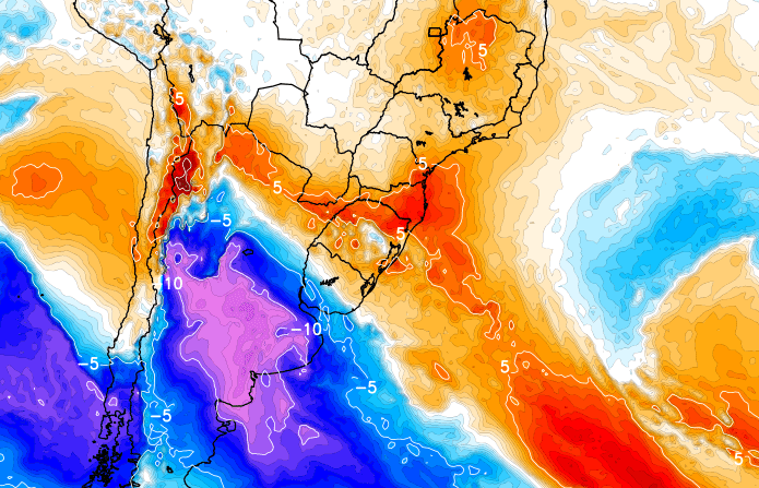 Antes de mais nada é preciso explicar que o mapa abaixo mostra a anomalia de temperatura no nível de 850hPa, em 1500 metros acima do solo. Esse é um dos critérios técnicos usados por meteorologistas para prever mudança no tempo e na temperatura. Atentem não é previsão de temperatura em superfície e sim o quanto a temperatura fica acima ou abaixo da média no nível de 1500 metros, ou seja, baixos níveis da atmosfera. É uma forma didática para mostrar ao leitor o grande contraste térmico esperado para o fim do mês. Tal contraste térmico configura uma frente fria que nada mais é do que uma zona de transição entre o ar quente e frio, no qual o ar frio movimenta a instabilidade e, por isso, recebe o nome de frente fria, pois é o frio que determina a trajetória do fenômeno e especialmente da chuva.
