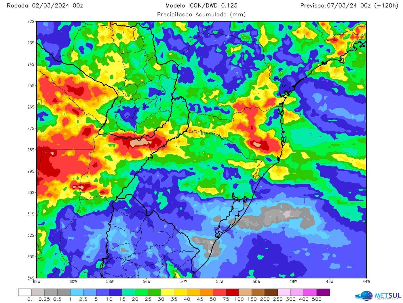 Da mesma forma, os acumulados de chuva pela frente não devem ser altos em grande parte do estado. O mapa abaixo com a projeção de chuva para cinco dias do modelo alemão Icon, disponível ao assinante (assine aqui) em nossa seção de mapas, mostra que a frente vai deixar pouca chuva em muitas áreas com acumulados perto ou acima de 50 mm apenas em parte da Região Sul.