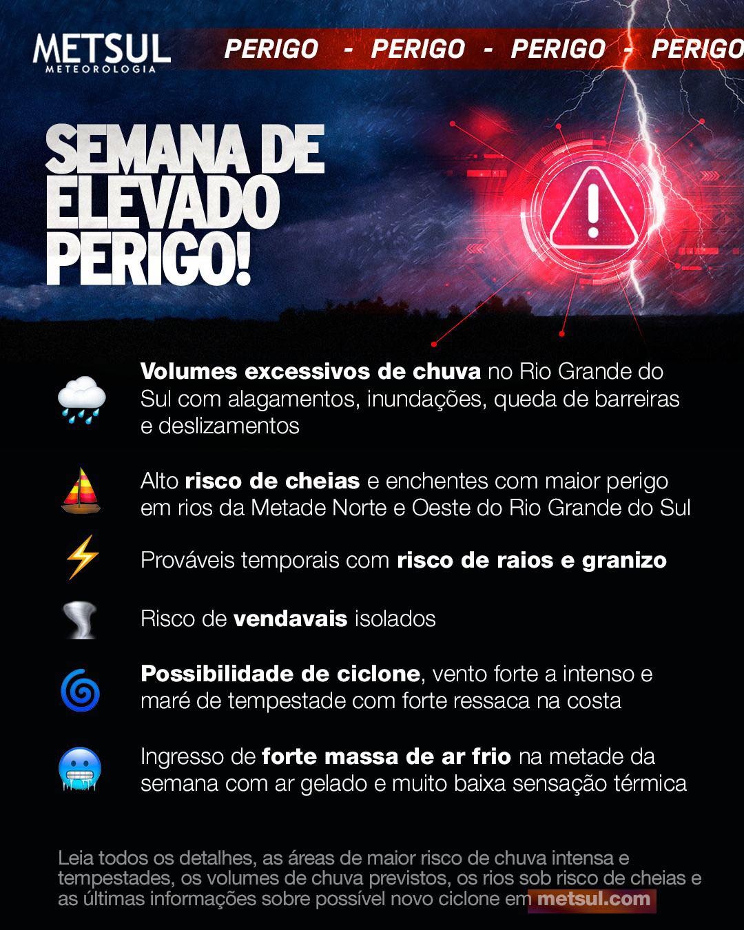 Não bastasse, haverá ainda uma forte corrente de jato (vento) em baixos níveis da atmosfera, originada na Bolívia, transportando ar quente de origem tropical para o Sul do Brasil e intensificando a instabilidade, o que agrava o risco de temporais.