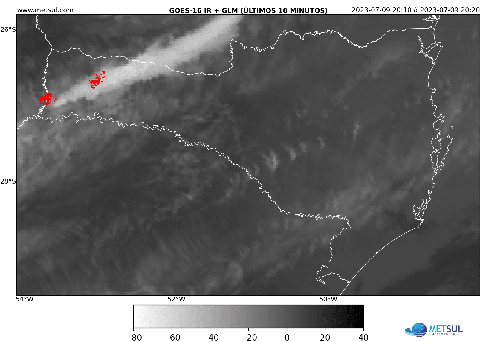 Imagem de satélite da tarde de hoje mostrava fortes núcleos isolados de instabilidade com temporais e raios (pontos vermelhos) no Oeste de Santa Catarina, acompanhando a instabilidade que se desloca de Norte para Sul, impulsionada por uma massa de ar mais quente.