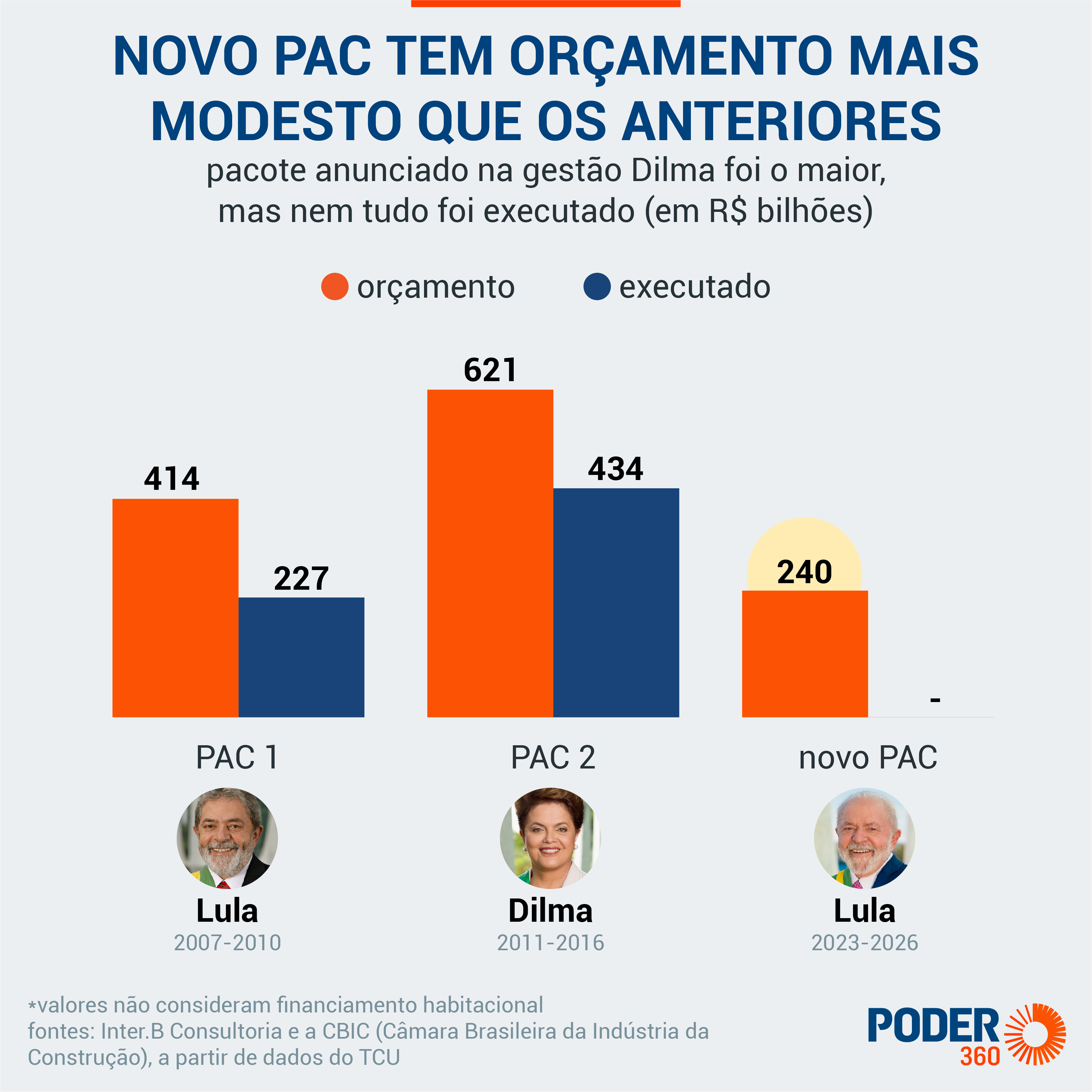 Embora Lula diga que lançará “o maior programa de investimento em infraestrutura que o país já viu”, o valor total que o governo prevê investir no novo PAC é menor que nas versões anteriores. Levantamento da Inter.B Consultoria para a CBIC (Câmara Brasileira da Indústria da Construção) mostrou que o orçamento para obras públicas do PAC foi de R$ 414 bilhões. Na 2ª versão estavam previstos R$ 621 bilhões.