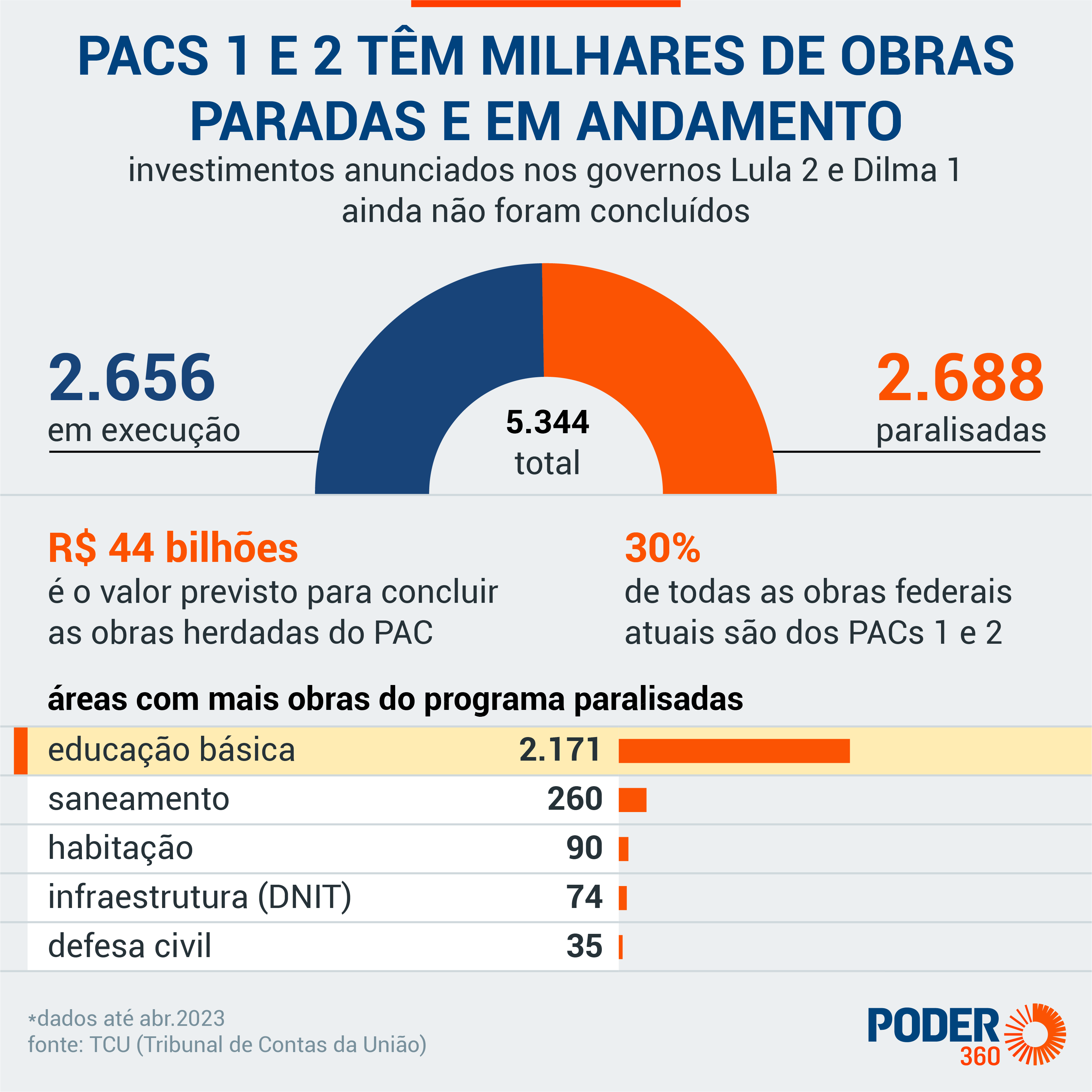 O governo precisará investir quase R$ 44 bilhões só para terminar os empreendimentos dos pacotes passados. Considera o orçamento total de R$ 57,40 bilhões do conjunto de obras que ficaram dos outros 2 programas –cerca de R$ 13,5 bilhões foram executados. Os dados são do TCU (Tribunal de Contas da União), que indica também que 30% de todas as obras federais no país hoje estavam nos PACs anteriores.