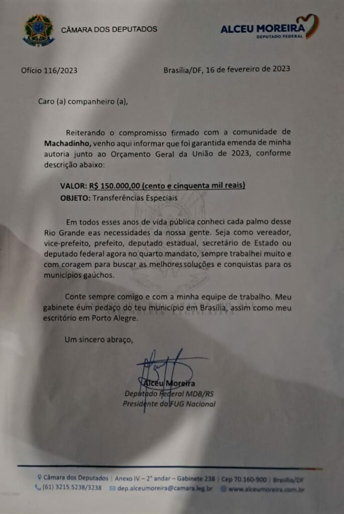Destinada através do Deputado Estadual Luciano Silveira, a emenda parlamentar de recursos especiais para utilização em diferentes áreas foi apresentada com o valor de R$150,000.00. Na mesma oportunidade o município recebeu a confirmação de mais um recurso para aquisição de maquinário (carregador) no valor de R$477,000.00, oriundo da destinação do Deputado Alceu Moreira.