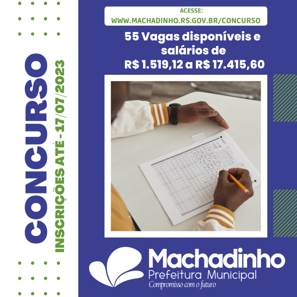 Para mais informações acesse o edital: www.machadinho.rs.gov.br/concurso