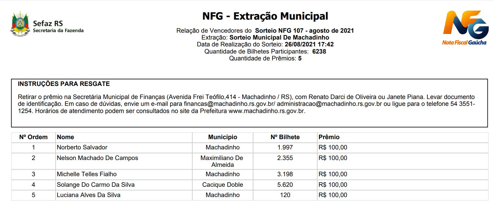 Segue o nome dos ganhadores do nota fiscal gaúcha do mês de agosto 2021