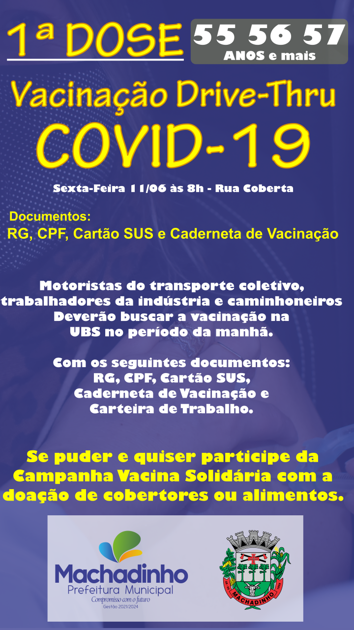 Na próxima sexta-feira, 11 de junho, será aplicada a vacina para pessoas com 55 anos e mais. Para receber a primeira dose, os machadinhenses devem comparecer a partir das 8 horas da manhã na Rua Coberta, de preferência dentro de seus veículos, munidos dos documentos solicitados.