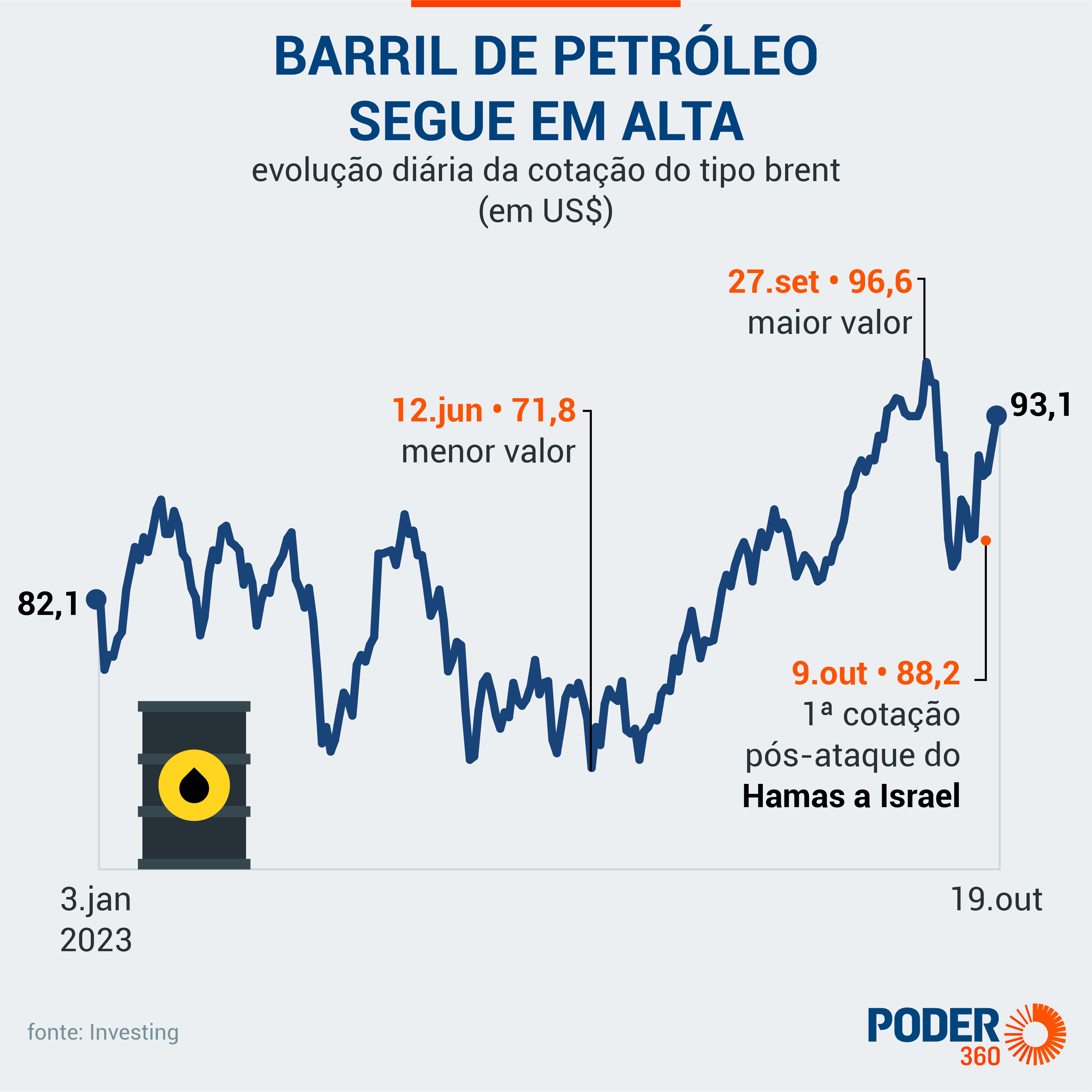 Em 28 de setembro, antes da guerra entre Israel e o Hamas, o preço do barril do petróleo havia batido o recorde do ano ao ser negociado a US$ 97,69.