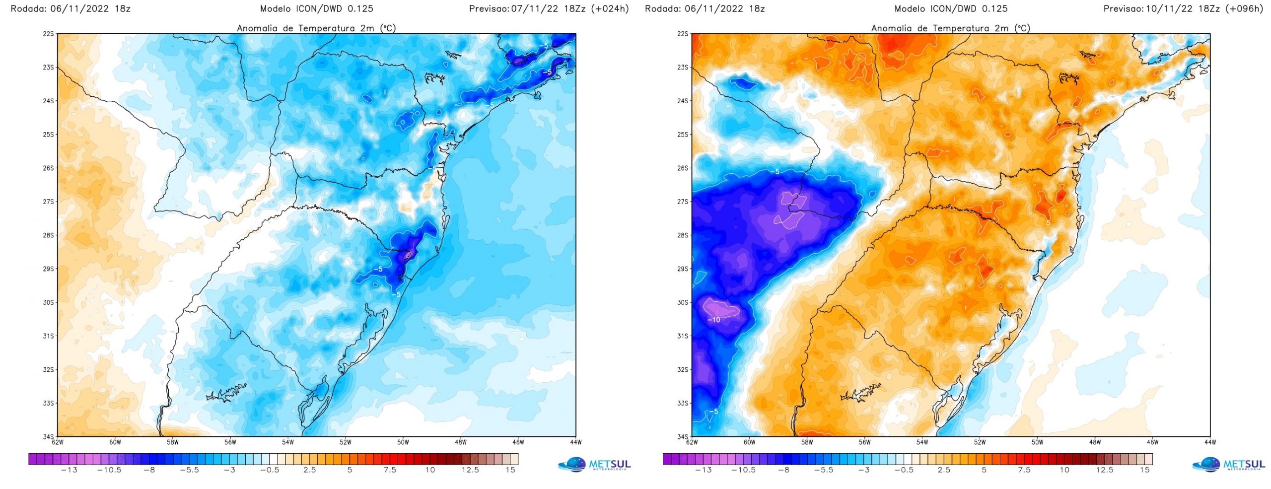 Projeção do modelo alemão Icon indica temperatura abaixo da média desta época do ano na tarde de hoje e acima da média na tarde da quinta-feira na maior parte do Sul do Brasil | METSUL