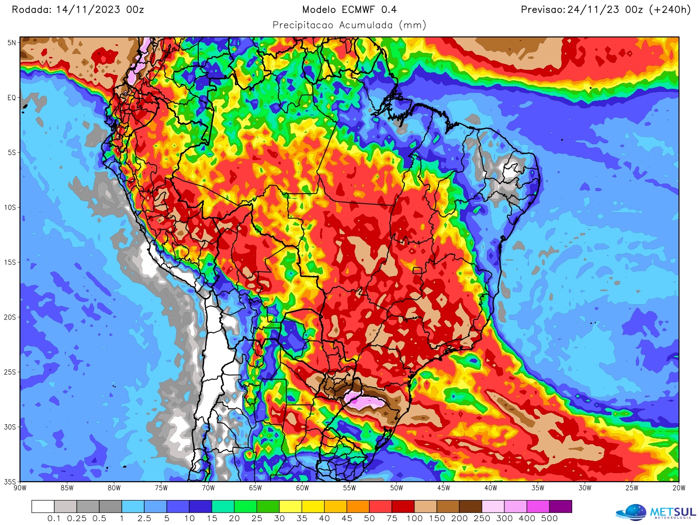 O mapa acima mostra a projeção de chuva para dez dias do modelo meteorológico europeu, disponível ao assinante (assine aqui) em nossa seção de mapas. Como se observa no mapa, a projeção do modelo é de muita chuva em grande número de locais do Centro-Oeste, do Sudeste e do Sul do Brasil.