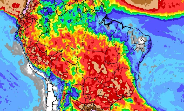 Já no Centro-Oeste do Brasil, a tendência é de chuva muito mais frequente e volumosa com o deslocamento de uma frente fria pelo Brasil. Será um alívio em muitas áreas que sofrem com calor extremo e tempo muito seco que leva, pelo depoimento de produtores rurais, as sementes a “assarem” no solo.