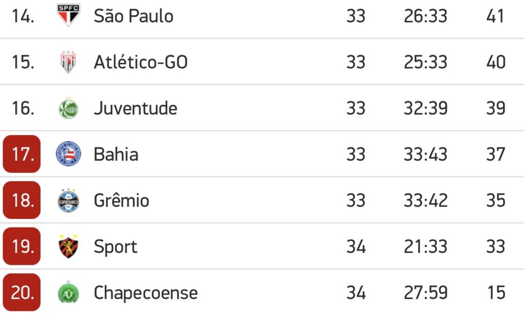 Veja a situação de momento da parte inferior da tabela do Brasileirão: