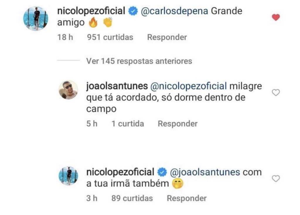 Atualmente jogador do Tigres, do México, o atacante Nico López fez questão de desejar sucesso na web ao seu compatriota uruguaio Carlos de Pena com a camisa do Inter – o novo reforço foi apresentado oficialmente neste domingo no Beira-Rio. Só que, nos comentários do Instagram, um torcedor colorado levou resposta ao deixar uma crítica ao próprio Nico.