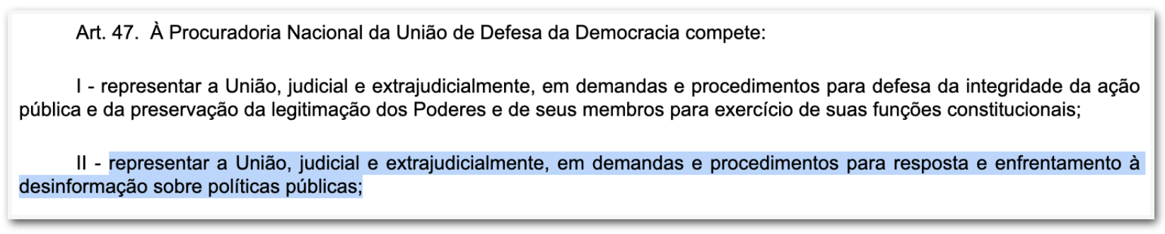 O trecho do decreto diz, estritamente, que a procuradoria deverá “representar a União, judicial e extrajudicialmente, em demandas e procedimentos para resposta e enfrentamento à desinformação sobre políticas públicas”.