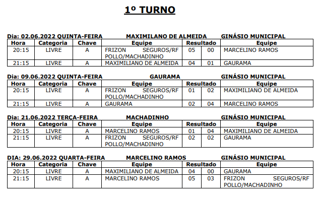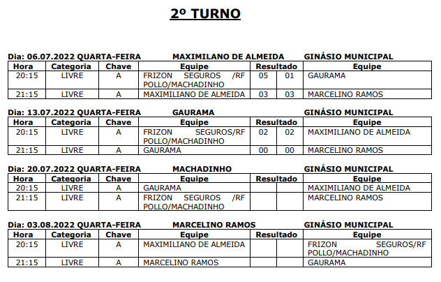 Na próxima quarta-feira, dia 20 de julho, Machadinho sediará a rodada final e decidirá em casa a permanência na disputa e a classificação para a próxima fase. Os jogos terão início a partir das 20 horas com o confronto entre as equipes de Maximiliano e Gaurama. Logo após a equipe da casa enfrenta Marcelino Ramos.