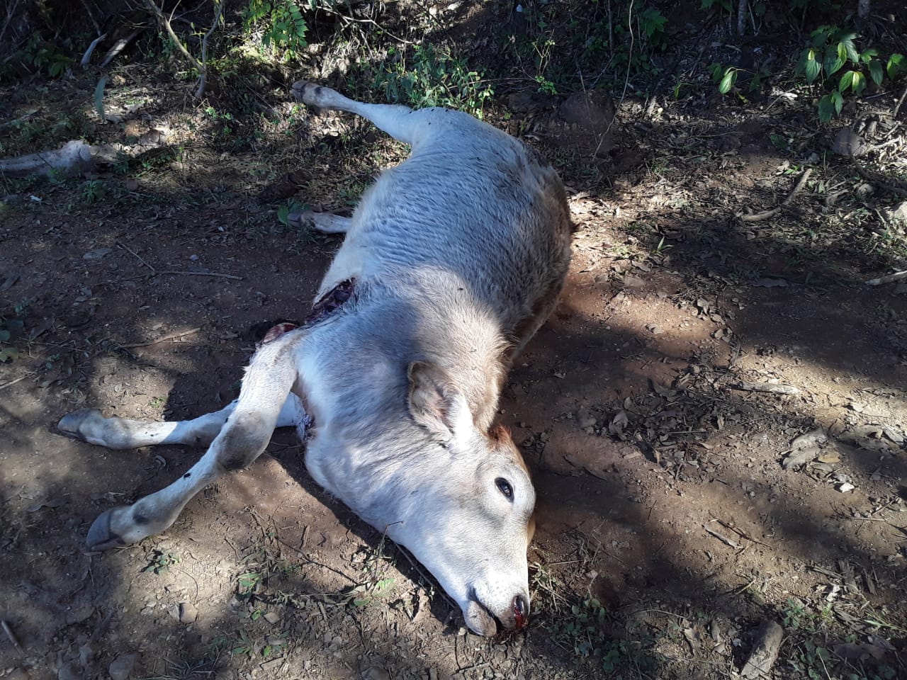 Um terneiro, novo, de aproximadamente 150 quilos foi encontrado com um ferimento grande na paleta dianteira e com o rabo decapitado.