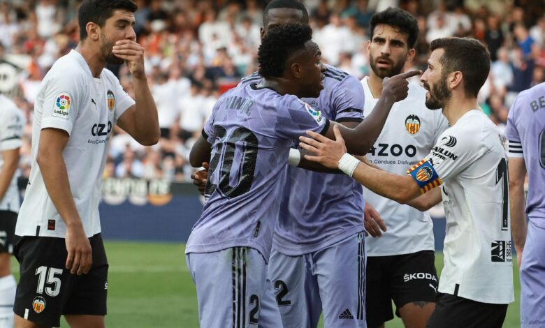 No Estádio Mestalla, torcedores do Valencia gritaram repetidas vezes “mono” (macaco) em direção a Vini Jr, que mostrou ao árbitro Ricardo de Burgos de onde vinham as ofensas. Ele identificou um dos torcedores e apontou para ele. O juiz, então, decidiu paralisar o jogo.