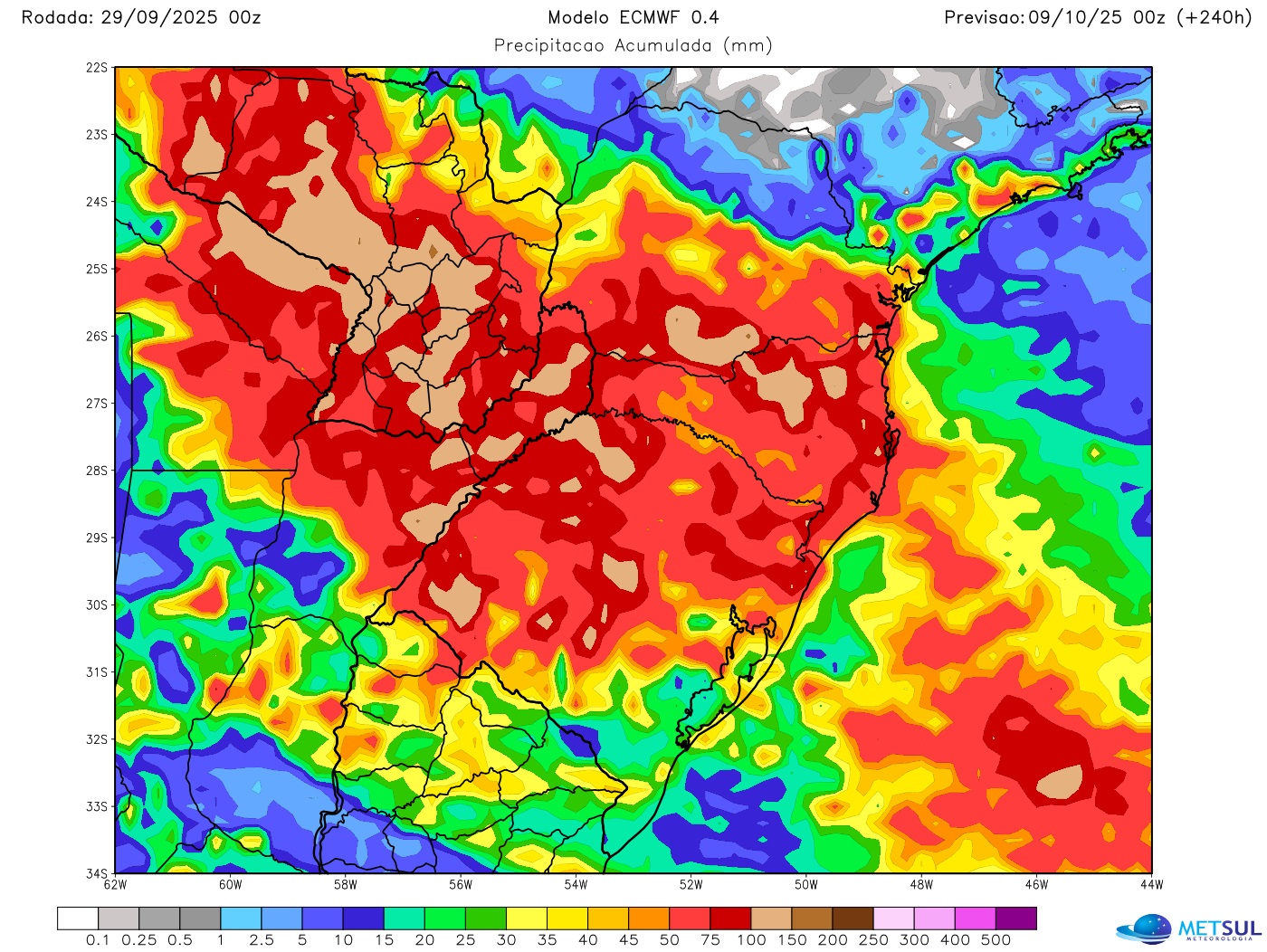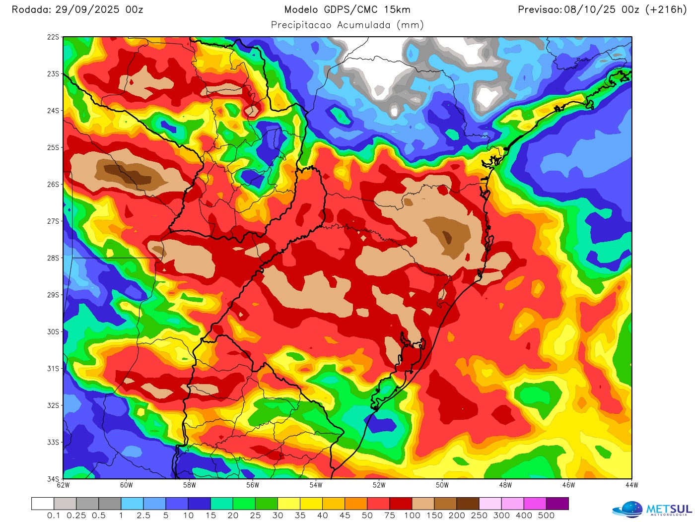 Os mapas a seguir mostram as projeções de chuva acumulada neste fim de setembro e no começo de outubro no Sul do Brasil a partir de dados dos modelos canadense e do Centro Meteorológico Europeu (ECMWF).
