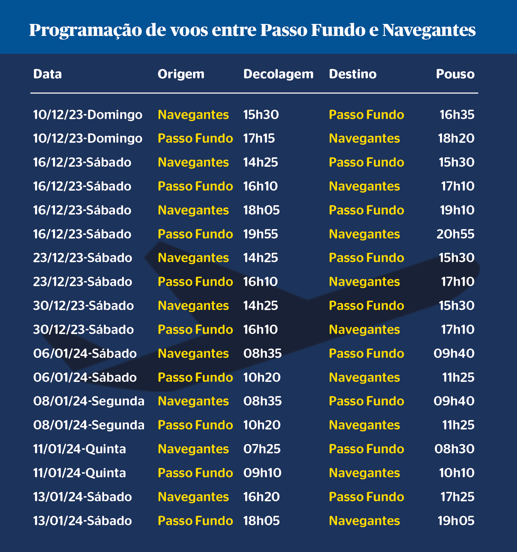 Voos entre Passo Fundo e Navegantes na temporada de verão